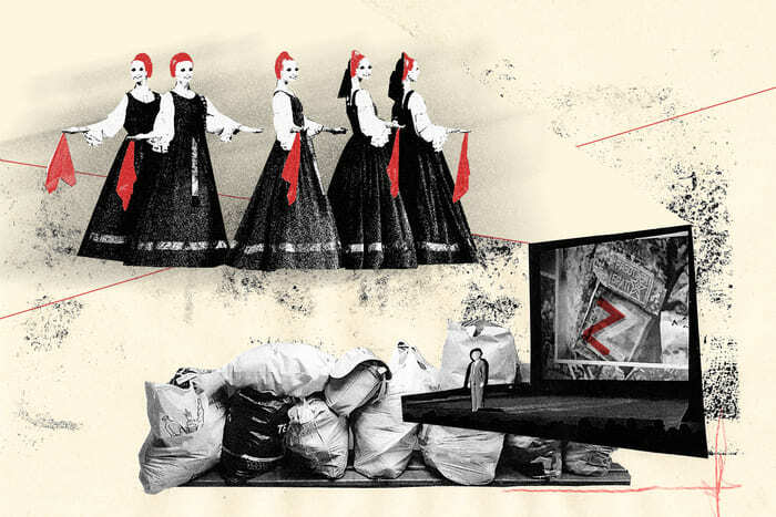 — Выступление танцующих бабушек посвящается присоединению к России бывших украинских территорий, — объявляет ведущая. Пенсионерки выплясывают сначала под украинскую народную песню «Гай зелёненький», а потом под композицию «От Волги до Енисея» группы «Любэ». На песне «Эх, Россия, жару поддай» в исполнении ансамбля «Дружина» зрительница с третьего ряда пускается в пляс и машет руками.