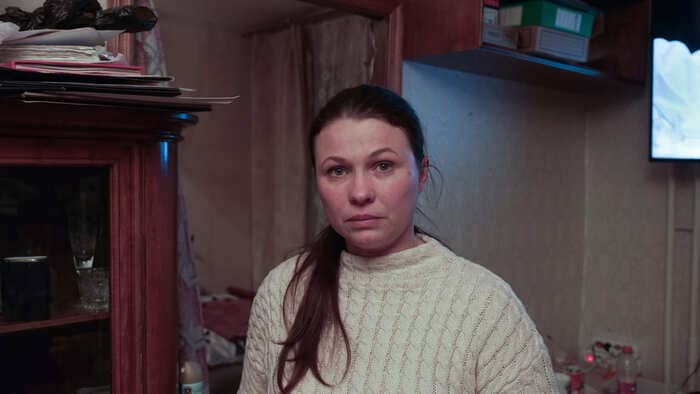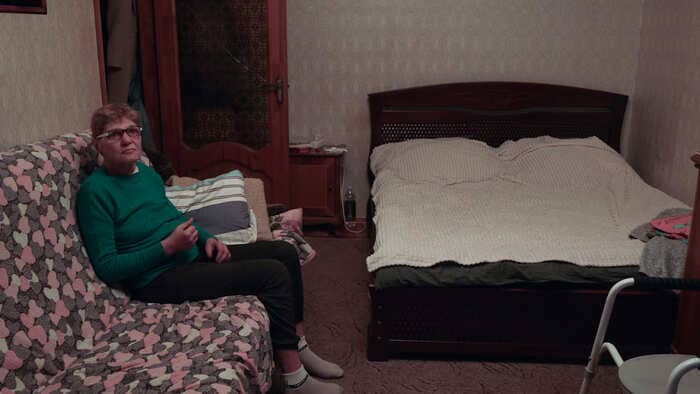 Они с Марией и младшей внучкой Виолеттой, девочкой лет двенадцати, сидят на кушетке в очередной, уже третьей съёмной квартире, тоже двухкомнатной. Рядом — ученический стол, заваленный детскими поделками. На дальней стене — новенький китайский телевизор. Скабеева сообщает последние новости с фронта. Куда-то едут танки, стреляет затянутая маскировочной сеткой пушка.