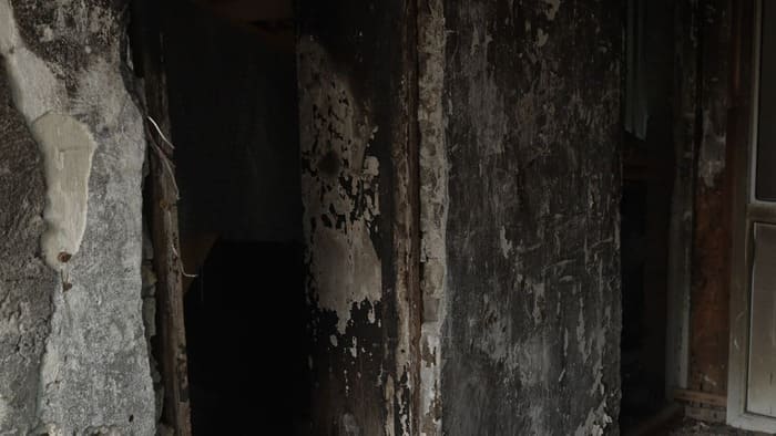 — Эта комната была молодёжной, — показывает она пустое тёмное помещение, неотличимое от соседних. — Два компьютера здесь было, электрогитары, беговой тренажёр Kettler. К племяннице приходили любители иностранных языков. Общались на английском и на китайском. | | | | После пожара во флигеле долго восстанавливали крышу, помещения заливали дожди, а место людей заняла чёрная плесень Фото: Владимир Севриновский | | | | Мария с трудом протискивается в свою бывшую квартиру мимо огромного разбухшего дивана. В дальней комнате сохранилась полуразрушенная двухъярусная кровать, где спали дочери. Под ней — старая куртка младшей, из которой та давно выросла.