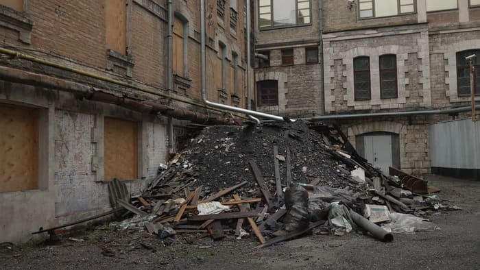 В подъезде, больше напоминающем пещеру, остался лишь один житель. На общую лестничную площадку у него выходила только дверь, сама же квартира была в прилегающем крыле. Ему повезло: от отопления и газа не отключили, так что к попыткам менее удачливых соседей добиться от властей ремонта он не присоединился: «Меня всё устраивает».