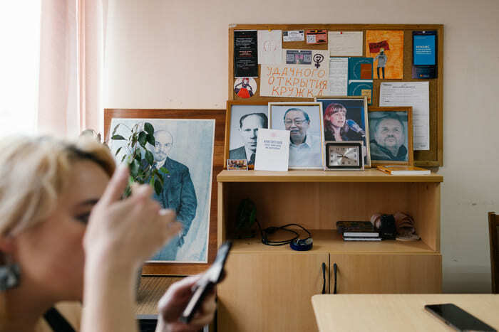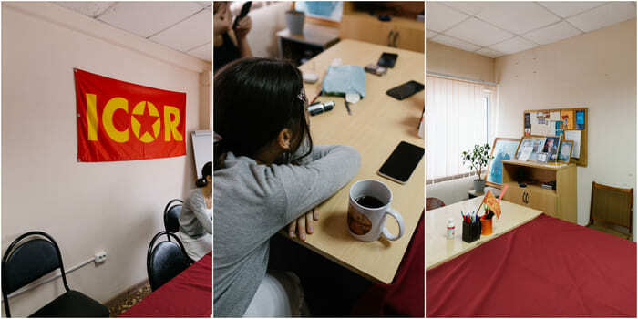 Губанов в беседе с журналистом «Новой вкладки» сказал, что феминистки могут «ругаться» с ним по двум причинам. Первая заключается в том, что кто-то из фемактивисток может сотрудничать с полицией и центром «Э». Вторая, более «правдоподобная», по его мнению, — зависть к его успехам в активизме. | | | | Стены в штабе УФИ увешаны портретами Ленина и символикой маоизма — присутствие феминисток здесь незаметно Фото: Новая вкладка | | | | На вопрос о том, смотрел ли он фильм с обвинениями бывших участниц фемдвижения, Кирилл отвечает отрицательно. Говорит, не хочет «тратить время и нервы».