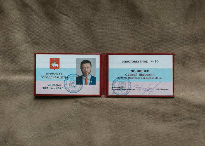 — Я тогда подумал: «Какая же лажа это Центральное телевидение, какое враньё кругом, просто ад какой-то». | | | | Депутатское удостоверение Медведев взял с собой, но теперь ценность этого документа сомнительна: однопартийцы лишили его мандата Фото: Ксения Галактион для НВ | | | | По словам Медведева, в лицее после выхода программы даже устроили специальное родительское собрание, на которое его не пригласили. На нём, как Медведев выяснил впоследствии, учителя собирали с родителей подписи против него, которые отправили пермскому детскому омбудсмену Светлане Денисовой. Впоследствии Сергей навещал её, но общего языка они не нашли. В комиссии по делам несовершеннолетних его ознакомили с целой пачкой жалоб на него и его сына Максима, написанных по одному шаблону.
