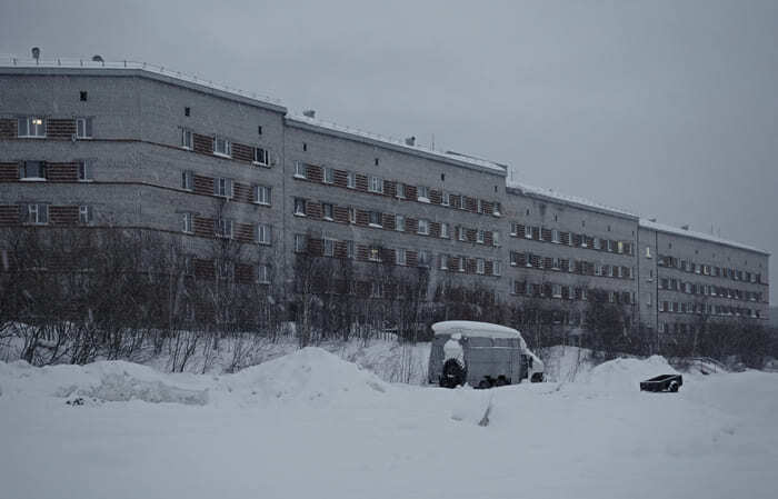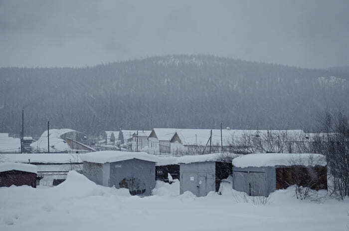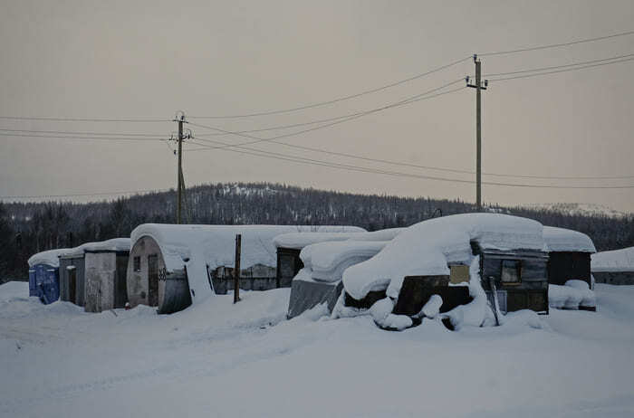 Кажется, он даже не понял, почему я задаю эти странные вопросы: та ситуация, в которую Навальный попал в Москве уже после смерти, здесь, в Харпе, где всё происходит в спокойном установленном порядке, казалась невообразимой. | | | | Такой вид открывается на Харп, если отойти пару шагов от гостиницы «Собь»: заснеженные бытовки, гаражи и сараи Фото: Иван Козлов | | | | Потоптавшись на пороге церкви, я предпринял вторую попытку добраться до рамки «Счастье не за горами», и она увенчалась успехом. Судя по всему, туристов в Харпе действительно немного — или они просто не знают об этом месте. К затерявшемуся в зарослях ольхи арт-объекту нет тропинки. Предполагается, что сквозь металлический прямоугольник должна быть видна панорама посёлка и горные вершины на горизонте, но с гор спускался снежный буран и вершины были не видны: в кадр «Счастья не за горами» попали только двухэтажные домики, свежеоблицованные хрущёвки и территория колонии, в которой закончилась жизнь Алексея Навального.