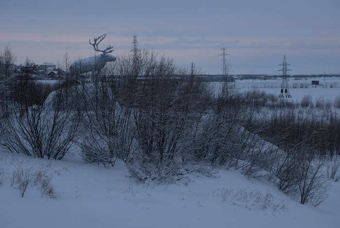 На этом диалог как-то завяз, и мы ещё несколько секунд постояли молча. | | | | Олени — животные, с которыми неразрывно связана жизнь Салехарда. Купить на местном рынке оленину проще, чем индейку Фото: Иван Козлов | | | | За гранитной стеной полицейского ждали ещё двое коллег. Видимо, они дежурили здесь весь день, поскольку люди успели организовать альтернативный мемориал около памятного знака «Исполнившему журналистский долг»: за ним никто не следил, и фотографию Навального, как и несколько скромных букетов, успело припорошить снегом.