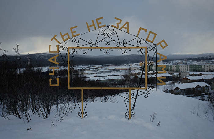 Ветер тем временем стал совсем невыносимым, и в снежном буране скрылись не только дальние гребни, но и холмы, окружающие посёлок. Казалось, что если мужчина заберёт ветер с собой, то Харп так и зависнет посреди этой пустоты. | | | | Не каждый гость Харпа доберётся до вершины холма, чтобы увидеть панораму посёлка сквозь рамку «Счастья не за горами» — тропинки сюда нет Фото: Иван Козлов | | | | В конце первого дня, проведённого в Салехарде, я спонтанно забрёл в арт-резиденцию «Полярис»: афиши обещали выставку современного искусства, а проект был поддержан Росмолодёжью, так что мне стало интересно, какое искусство показывают при господдержке за Полярным кругом. Я изучал вывешенный в фойе список участников выставки, когда услышал за спиной: