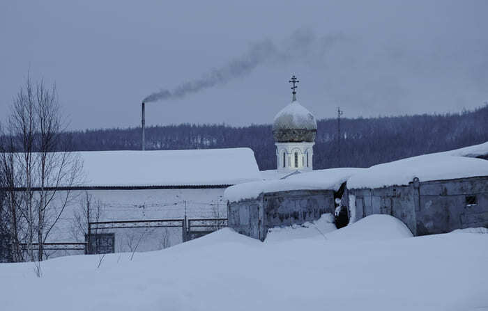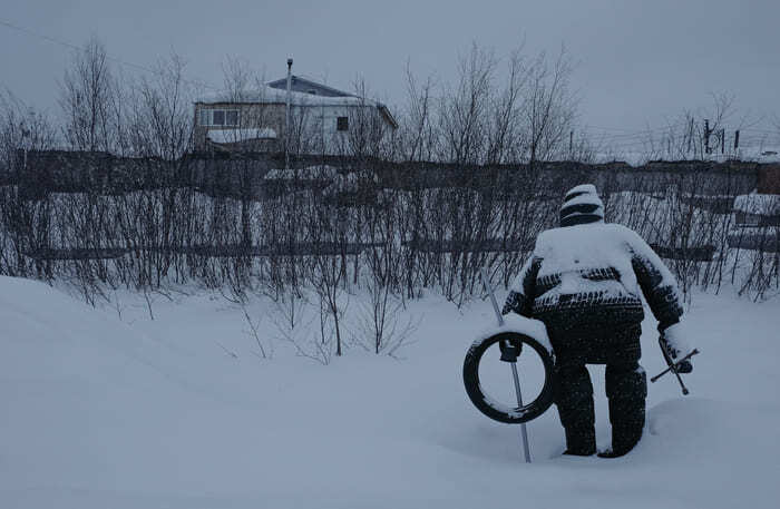 За пять минут, что длилась эта бестолковая сцена, погода на улице радикально переменилась. Харп оказался обманчив: стоит расслабиться, как выяснится, что тобой интересовались следователи в гостинице; стоит порадоваться пасторальному снегу, как приходится вспоминать о «штормовом предупреждении». Ветер налетает мгновенно, и сила его такая, что по улицам становится трудно ходить. | | | | Человек из покрышек — творчество местных умельцев Фото: Иван Козлов | | | | К местному кладбищу удалось подобраться только с самого края: туда снегоуборщики не доехали, и дорогу занесло снегом. Поэтому в оставшееся время до поезда я постучался в церковь Рождества Богородицы в местном сквере (ещё один храм — Сергия Радонежского — расположен за забором «Полярного волка», а в «Полярной Сове» только небольшая часовенка), но она оказалась закрыта. С её настоятелем — отцом Михаилом, который служит здесь уже более десяти лет, — мы позже связались по телефону. Это было уже в те дни, когда тело Навального довезли до Москвы, и его соратники едва нашли священника, чтобы его отпеть. Мы поговорили о жизни в посёлке (отец Михаил тоже сказал, что ничего как будто и не произошло, никто не ставил свечей за упокой раба божьего Алексея и не подавал записок о поминовении), а затем я спросил его, согласился бы он отпевать Навального.