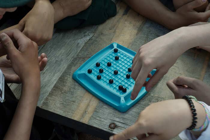 — Может, это эгоистично, но во многом то, что мы делаем, мы делаем для себя и по личным причинам. Я уже год живу с сильным выгоранием, недавно коллега спросила меня, когда я последний раз чувствовала радость и заряжённость, — и я поняла, что это было как раз во время недели в колонии. Удалось создать всем — и нам, приехавшим, и ребятам, которые нас приняли, — поле, в котором радостно. Надеюсь, у ребят было похожее ощущение, — говорит она. | | | | Пацаны играют в настольную игру «Мемо» на стадионе. У того, кто в центре, татуировка «Прости господь за мамины слёзы» Фото: Полина Сойреф для НВ | | | | В последний момент Сусанна решилась проводить мастерскую по художественным практикам, хотя все переживали, что рисование и коллажи — не те занятия, которые выберут парни 14−18 лет. В итоге в мастерскую к Сусанне ходили всего пять человек, «рискнувших отделиться от основной массы».