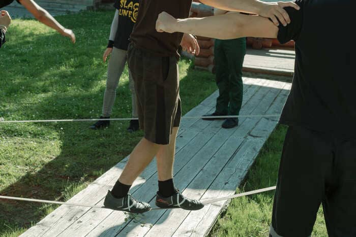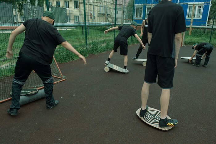 По вечерам мы пели под гитару Цоя и «Короля и шута» — кто-то из ребят подпевал, кто-то просто слушал. В последний день спрашивают: «Вашу музыку мы слушали, а хотите послушать нашу?» — выносят на стадион колонки и ноутбук и запускают свой плейлист. Следующие полтора часа мы играем в футбол и волейбол под русский рэп. | | | | Сусанна Воюшина организует художественные фестивали в Архангельске, а в колонию привезла слэклайны и баланс-борды.