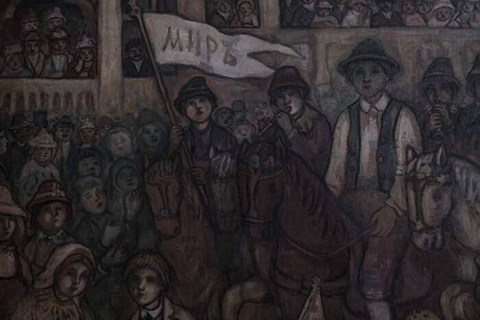 Работы Честнякова со сценами из крестьянского быта больше походят на иллюстрации к детским книгам. Мне в глаза бросились наряды детей: почему-то все они были в ярких платьях и элегантных шапочках.