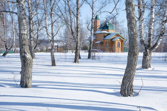 Выход к реке — в проулке. Справа — жилые коттеджи, слева — двухэтажное, как будто полузаброшенное здание, рядом с ним на деревянном столбике, вкопанном в землю, развевается флаг «Единой России». | | | | Мечеть построили между сёлами Кафтанчиково и Барабинка в 2010-е годы Фото: Новая вкладка | | | | Берег Томи невысокий, застроен коттеджами. Ближе к воде — поломанные заборы вдоль огородов и заросли кустов. На реке ни рыбаков, ни лунок — всё под сугробами. Недалеко от кромки воды виднеется большая табличка «Купаться запрещено». «Наверное, после Навального поставили», — иронизирует коллега-фотограф.
