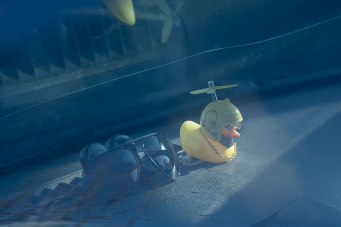 — Девчонки, вот вы куда идёте? Ведь сколько уже народу тут передавили! Вы по какой стороне [дороги] идёте, в школе не учились? Вы, простите, я грубо скажу, но у вас на жопе глаз-то нету! | | | | Резиновый утёнок в каске на приборной панели автомобиля, припаркованного у одного из зданий Кафтанчиково Фото: Новая вкладка | | | | От мужчины пахнет алкоголем. Наш разговор проходит под новости и русские поп-хиты нулевых: в кармане у него телефон с включённым радио.