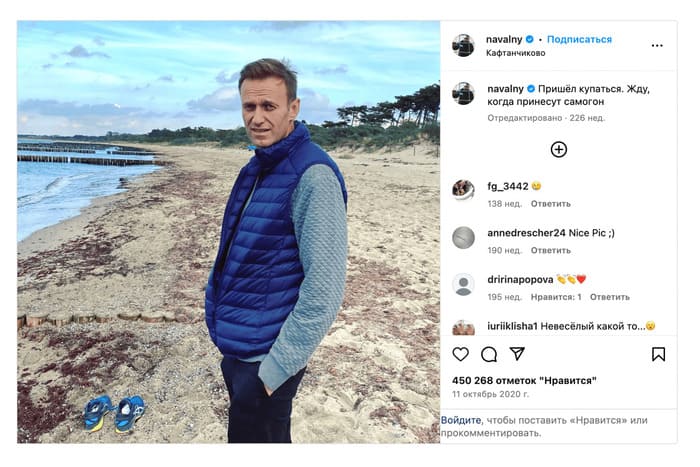 На заборе сидит рыжий кот. «Он меня охраняет», — с теплотой говорит пенсионерка. | | | | Скриншот: инстаграм* Алексея Навального | | | | Кафтанчиково — большое село на берегу реки Томь в пятнадцати километрах от Томска. Через два года поселению, в котором живут около 1700 человек, будет 400 лет, но известно оно больше не своей историей, а тем, что 19 августа 2020 года, накануне своего отравления, сюда приезжал купаться Алексей Навальный.