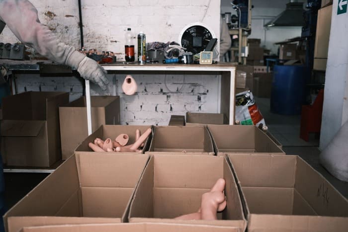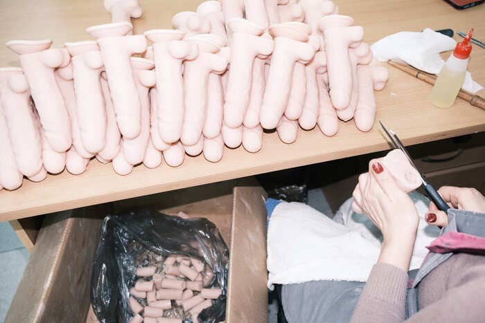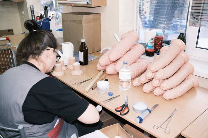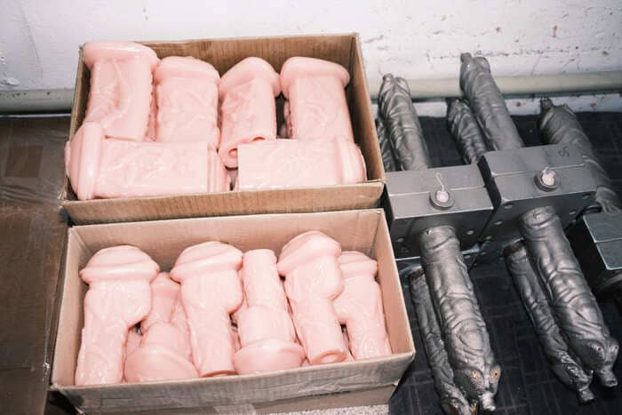 В соседнем помещении замечаем длинный металлический стол с инструментами, на ножки которого натянуты резиновые присоски для фаллоимитаторов — чтобы не шатался. «Мой лайфхак», — улыбается бригадир. | | | | Остатки полимерного материала Lovetoy продаёт партнёрам, которые делают из них резиновую обувь Фото: Алина Десятниченко для НВ | | | | На производстве фаллоимитаторов используют протезную технологию: снаружи изделия мягкие, а внутри — жёсткие. Производители говорят, что так добиваются максимальной схожести с половыми органами Фото: Алина Десятниченко для НВ | | | «Литейка» находится в том же здании этажом выше, тут шумно и сильно пахнет пластиком: это плавится смесь из полимера и вазелина, из которой отливают фаллоимитаторы. Розовое крошево на ощупь влажное и немного маслянистое. Чтобы отбить запах резины, в него добавляют персиковую отдушку. До войны, рассказывает Канунов, они закупали полимеры во Франции, а вазелин — в Индии, Южной Корее и Турции. Теперь первые приобретают в Китае, а второй — в России. По словам Канунова, по цене выходит дешевле, а качество их устраивает. Четыре года назад он рассказывал журналистам, что с отечественным сырьём бывают проблемы из-за несоблюдения стандартов логистики и хранения. — У нас же был стереотип, что европейское лучше. Я от этого стереотипа плавно избавился, — говорит теперь предприниматель. Определить, чем сегодня занимается каждый сотрудник литейного цеха, можно по картонным коробкам, в которые скидываются готовые изделия. Одна доверху забита вагинами — отдельно от женского тела они выглядят своеобразно. В профиль игрушка похожа на грибок: шляпка-вульва с подкрашенными ярко-розовой краской губами и продолжающий её ствол, который имитирует влагалище. Снаружи на стволе, видимо для эстетичности, выполнен античный барельеф с мужчинами и женщинами в туниках. Елена, которая проводит нам экскурсию по цеху, говорит, что у этой модели есть особенность. — Какая? — заинтригованно спрашиваю я. — Она девственница, — с улыбкой уточняет девушка. Оказывается, у вагины имеется тонкая плёнка, которая порвётся при первом использовании. При этом «девственница» может ещё и вибрировать — Елена показывает отверстие, в которое вставляется моторчик. Большинство коробок в этот день заполнены фаллоимитаторами. Несколько «Гигантов», подвешенных за яички по периметру коробки, сохнут — их, как и прочие изделия, предварительно припудрили, чтобы они не слиплись. Рядом лежат двойные фаллоимитаторы — на сайте они обозначены как игрушки для пар, между собой сотрудники называют их «лесбиянками». | | | | Собирая первые фалоимитаторы в московском секс-шопе, Вадим Канунов параллельно консультировал покупателей в магазине, опираясь на свой опыт врача-гинеколога Фото: Алина Десятниченко для НВ | | | | Комплектующие для игрушек отливаются отдельно. Литейщик Виктор сегодня занимается присосками для фаллоимитатора. На его столе — несколько десятков одинаковых металлических форм, похожих на гантели. Он придвигает ко мне пустую форму и предлагает попробовать сделать одну присоску самостоятельно.